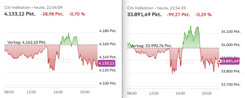 Um 15: 30 wird die Lethargie belohnt. Die Arbeitsmarktdaten sind zwar ein Albtraum, jedenfalls für den Markt. 517.000 offene Stellen, 190.000 wurden erwartet. Zunächst dachte ich, es handele sich um einen Tippfehler. Und dann geschieht das absolut Surreale: Nach einem kurzen Einknicken explodieren die Kurse nach oben. Tesla steigt wie blöd. Diesmal nutze ich die Chance. Mit klopfendem Herzen verkaufe ich beim Kurs von 181,83 mit rund 460 Euro Gewinn. Coinbase und Digital Ocean, die ich um zusammen für mickrige 100 Euro Verlust loswerden kann, schicke ich hinterher. Alles round about 18:00. Und weil es so schön ist, fliegen die beiden Themen-ETFs bei Scalable gleich mit. All in all hole ich damit weitere 9.000 Euro aus dem Markt. Ich kann es kaum glauben! Im Verlauf des Abends treten die Kurse den Rückzug an, es geht sogar saftig nach unten. Ich bin stolz auf mich. Wie es aussieht, konnte ich von einem Short-Squeeze profitieren. Und das auch noch am Peak. Yeah. Normal ist das alles nicht. Wenn man sich die Chartbilder vom S&P (links) und vom Nasdaq anschaut, wird deutlich, dass der Markt verrückt spielt. Weg hier!