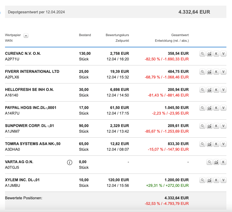 Mein Schrottdepot ist voll von Kandidaten, die aktuell nur von der Spekulation leben, dass sich wenigstens die Hälfte erholen möge. Sie leben von Hoffnung und Geduld. Und ich habe beides nur in Maßen. Wie VARTA zeigt, gibt es trotz des Vorsatzes zum Durchhalten einen Punkt, an dem ich jegliches Vertrauen verliere und das Trauerspiel schlicht und einfach nicht mehr sehen will, egal, was es kostet. Nennen wir es Depothygiene.
