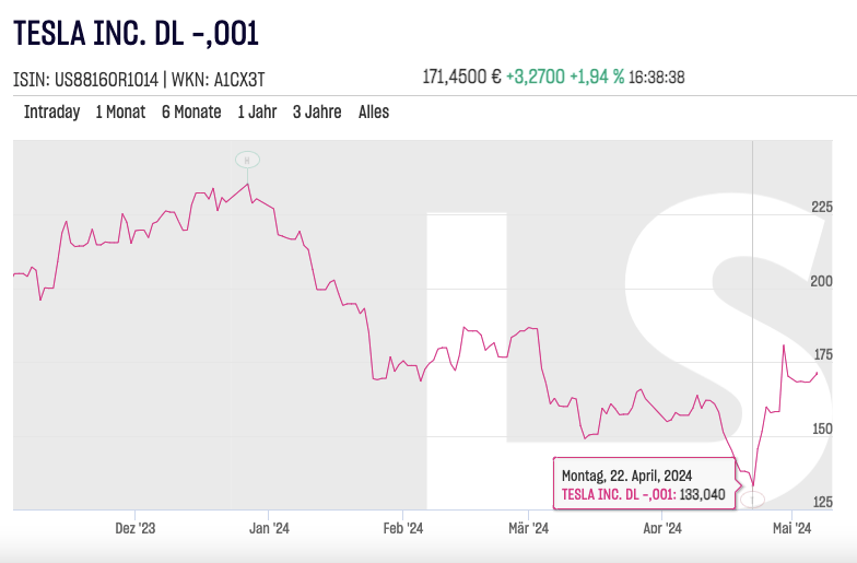 Aktuell verharrt der Wert seit einer Woche um die 170 Euro. Davor hatte es einen heißen Ritt gegeben. Seit Anfang des Jahres war die Aktie zunächst von 230€ um 40% gefallen und hatte sich damit aus dem Team der Magnificant 7 disqualifiziert. Der Tiefpunkt lag am 22.4. bei 133 Euro. Aber dann, Ende April ging es nach schlechten Zahlen, dafür aber umso besserem KI- und Autonomous-Driving-Bla-Bla sowie einem China-Besuch von Elon Musk mit angeblich positiv abgeschlossenen Daten-Rechte-Verhandlungen innerhalb von einer Woche 30 Prozent rauf.