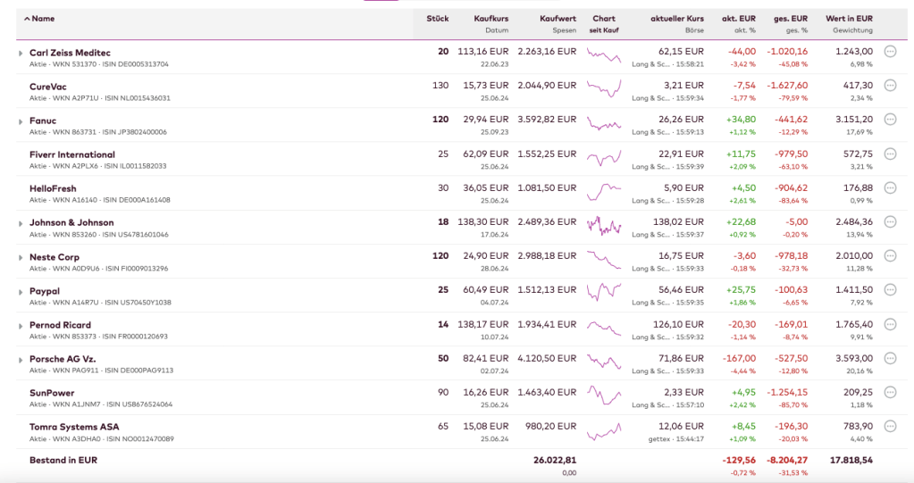 Kein einziger Wert befindet sich aktuell im Plus. Was fairerweise auch daran liegt, dass ich die Aktien, die Ende Mai/Anfang Juni Gewinne ausgewiesen haben, sukzessive verkauft habe. Für den Moment erweist sich das sogar als gute Entscheidung, da die Erträge inzwischen dahin geschmolzen und Aktien wie Merck oder Hexagon, sogar ins Minus gedreht wären.